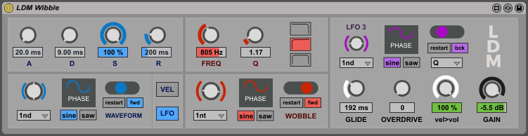 A monophonic bass synth designed for making wobble bass sounds, but can be used as a lead. A customizable LFO controls the wobble of the frequency. A variable square oscillator is used which also has its own LFO. A third LFO can be assigned to different parts of the device. Includes glide and overdrive.