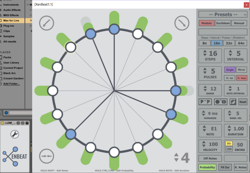 XenBeat is a circular algorithmic sequencer based on the unique Modulo algorithm for generating rhythmical sequences. It also has Euclidean mode and complete manual control, and includes plenty of randomization and probability options. It comes packed with presets from traditional world rhythms to spark your creativity. You can modify each individual note, velocity, duration, and probability per step, and introduce humanization of the note onset and velocity level. There are also handy controls to subdivide the steps, double the sequence, auto-generate velocity and note values, and invert the pulses.